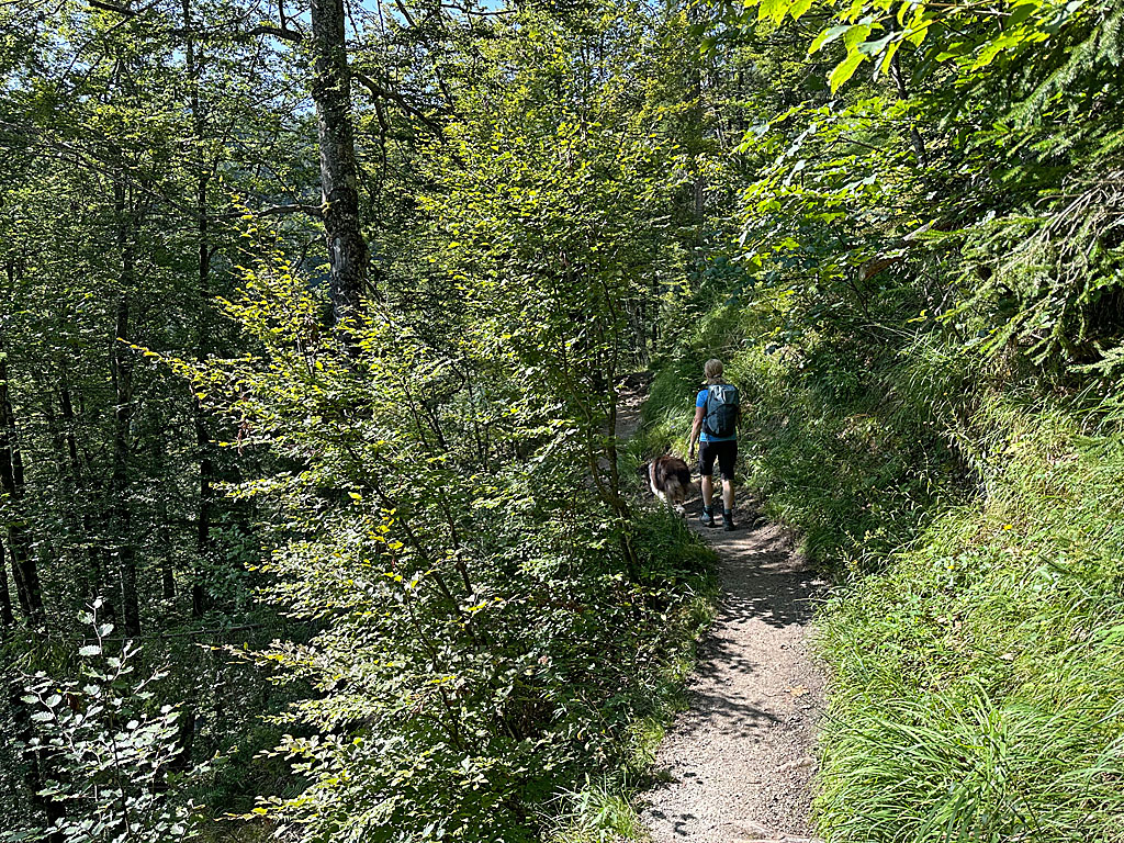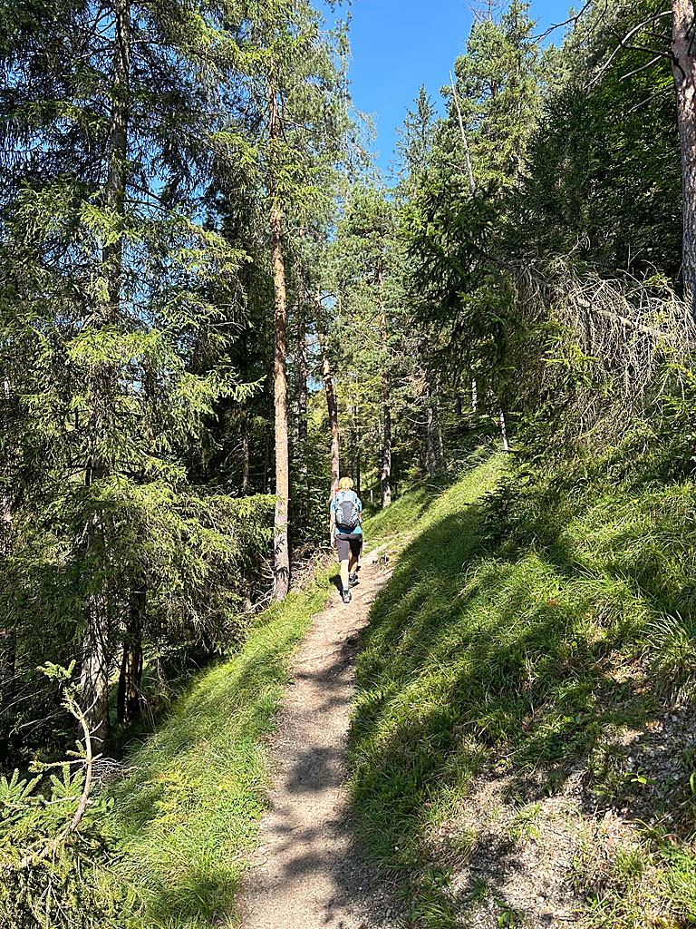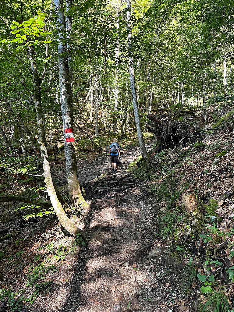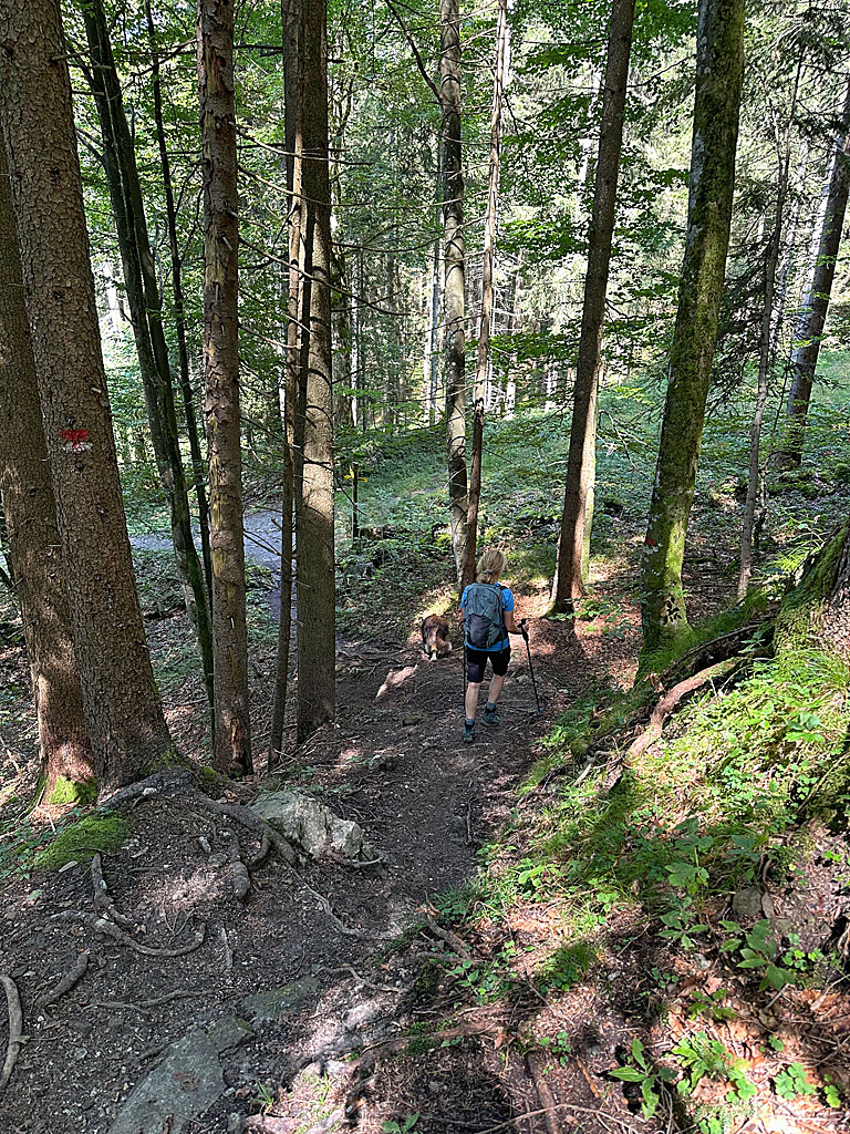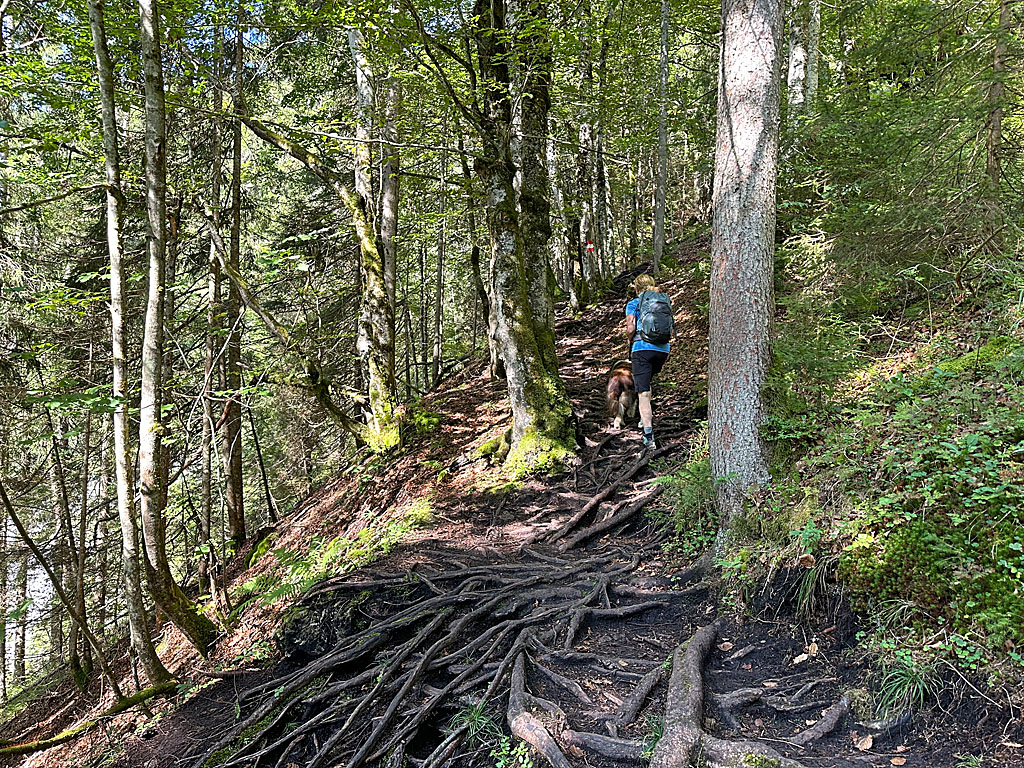 ...geht es auf teils wurzeligen Wegen zügig bergab