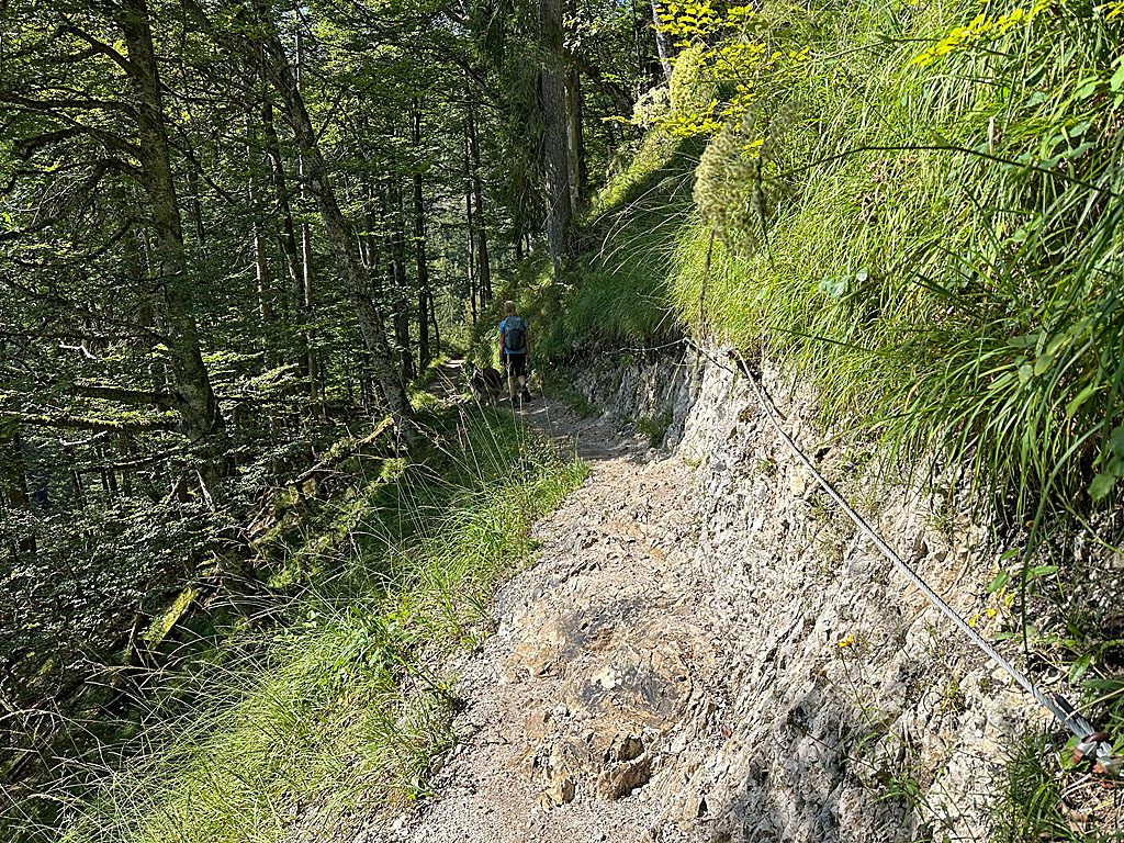 An einem schrofigen Wegabschnitt findet sich ein Drahtseil