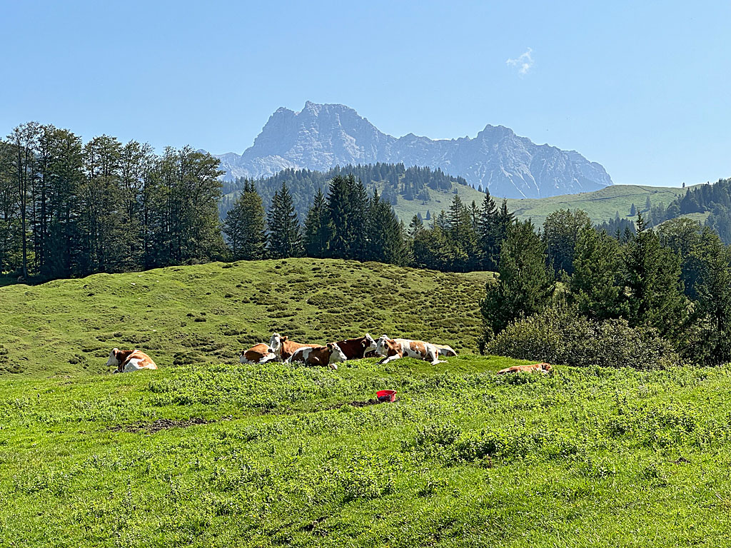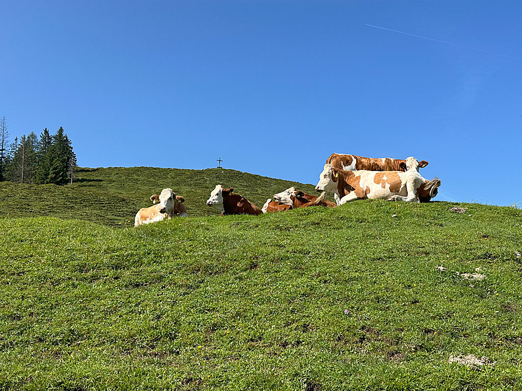 Die Kühe rasten am Fuße des Angerlkreuzes