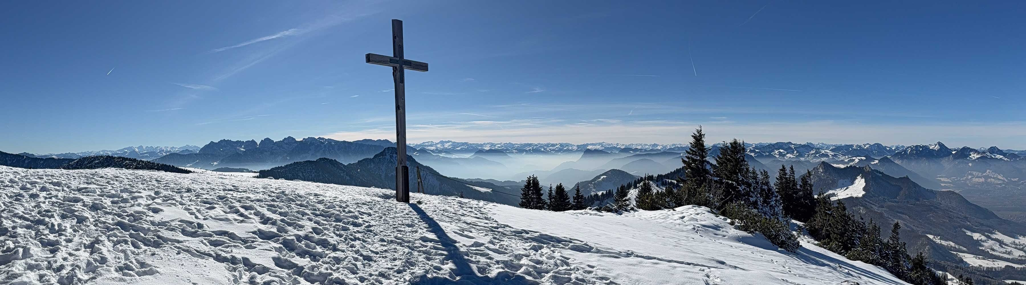 Besuchermagnet am Tegernsee: Der Wallberg ist auch zur kalten Jahreszeit kein Garant für Bergruhe und Einsamkeit. Im Winter zieht der beliebte Aussichtsberg die Wintersportler und Rodler an. So liegt bei einer Winterwanderung die größte Gefahr darin, von einem übermütigen Rodler überfahren zu werden. Nach der Bergstation der Seilbahn kehrt dann auch langsam Ruhe ein. Der Weiterweg bis zum höchsten Punkt ist etwas anspruchsvoller und nichts mehr für Bergtouristen mit schlechtem Schuhwerk. Gerde für die felsigen Passagen im Gipfelbereich ist die Mitnahme von Grödel wichtig. Am großen Gipfelkreuz kommt man in den Genuss eines herrlichen Tiefblicks hinunter zum Tegernsee und einer Fernsicht, die bis zu den Hohen Tauern und den Zillertaler Alpen reicht.